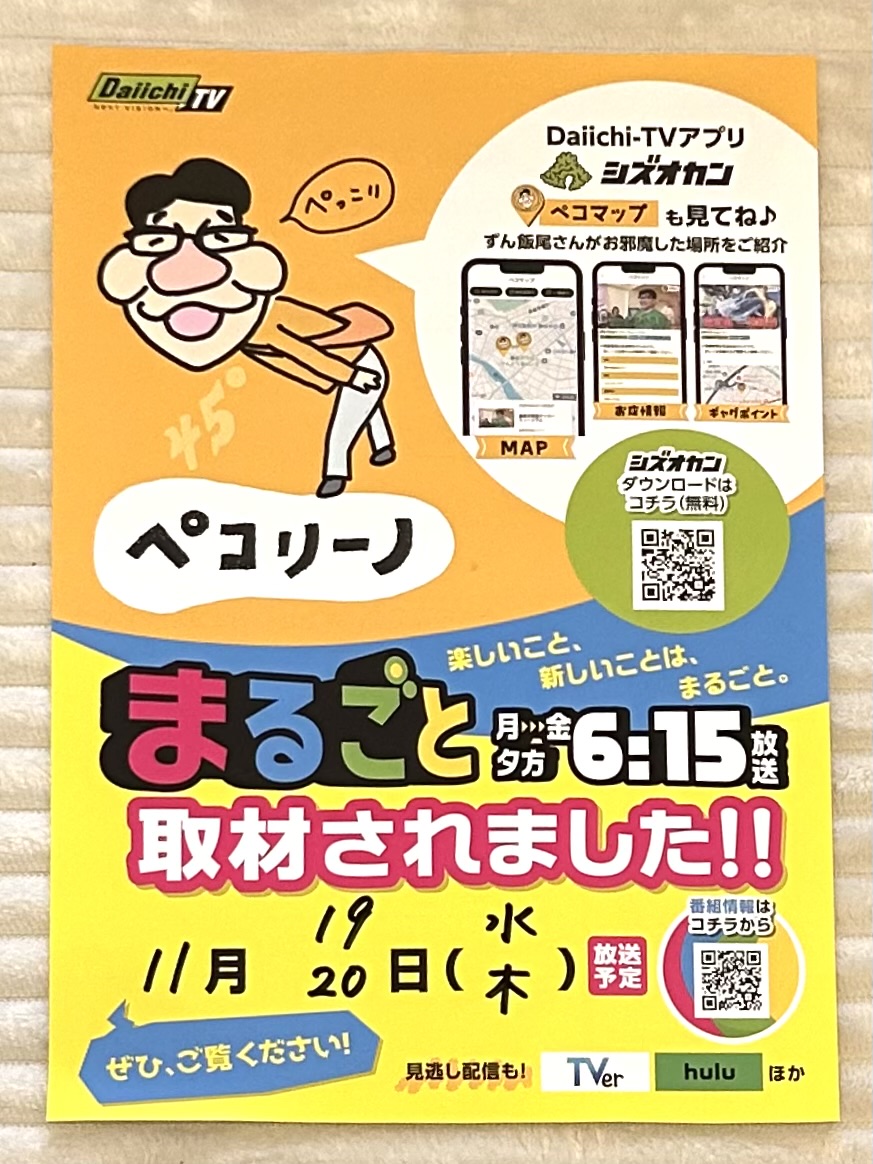 11/19(水)20日(木)18時49分頃より 取材して頂きました。良かったら見てくださいね。